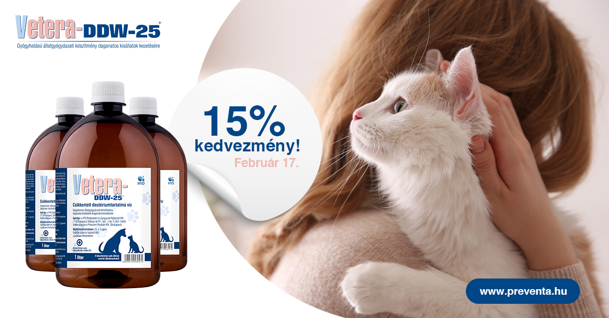 Kedves Vásárlóink! Február 17-e a macskák világnapja, ebből az alkalomból február 17-én, hétfőn, 15% kedvezménnyel vásárolhatják meg a Vetera-DDW-25 csökkentett deutériumtartalmú állatgyógyászati készítményt kedvenceiknek.