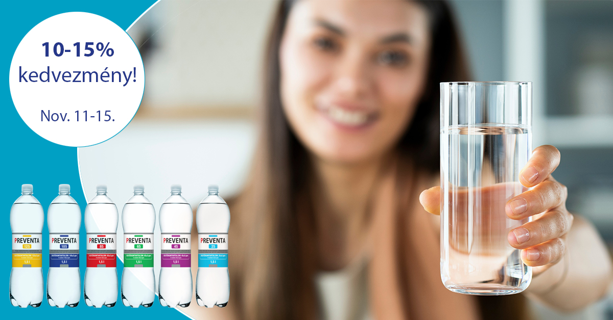 Kedves Vásárlóink! Tájékoztatjuk Önöket, hogy november 11. és 15. között 10% kedvezménnyel vásárolhatják meg a Preventa csökkentett deutériumtartalmú ivóvizeket üzletünkben és webshopunkban, a készlet erejéig. A kedvezmény a megjelölt időszakban egyéb termékeinkre is érvényes, 5%-os mennyiségi kedvezményünkkel is összevonható!