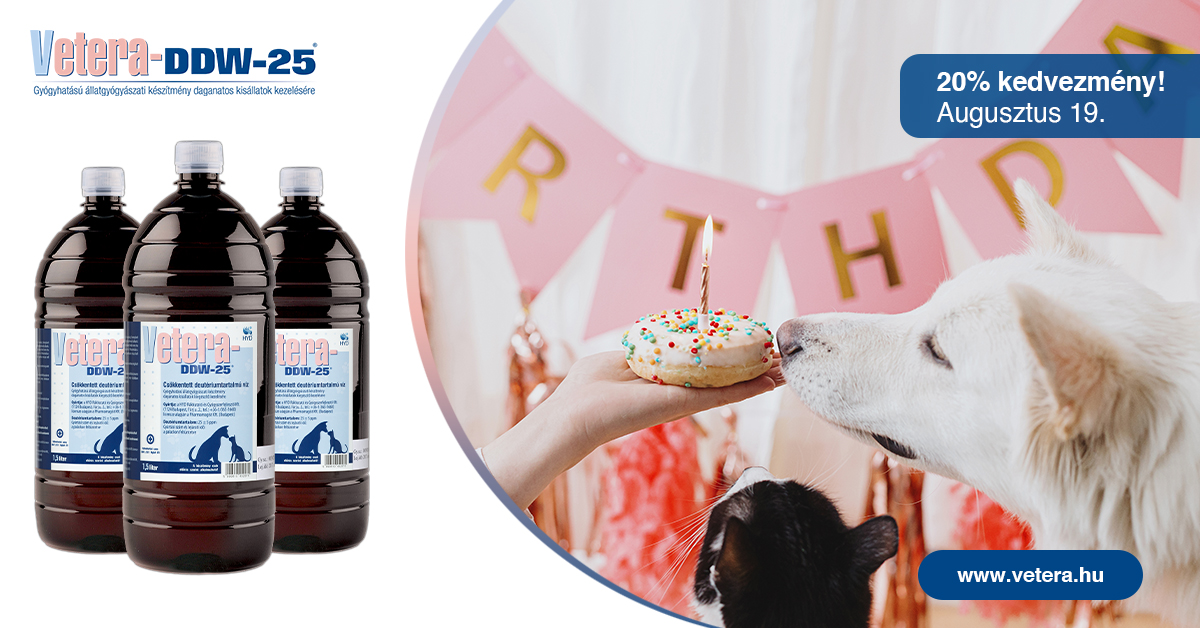 Kedves Vásárlóink! Idén már 23 éves állatgyógyászati készítményünk, a Vetera-DDW-25! A csökkentett deutériumtartalmú víz hatóanyagú állatgyógyszer törzskönyvére 1999. augusztus 19-én került rá a pecsét, ebből az alkalomból augusztus 19-én 20% kedvezménnyel vásárolhatják meg a terméket mintaboltunkban és webshopunkban.